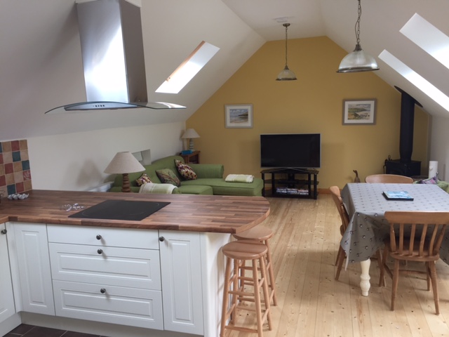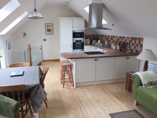 Upstairs, you lead into the living area via a glass and steel balustrade onto a fully-fitted kitchen with all modern facilities including dishwasher, induction hob, split-level cooker and microwave. All the utensils, crockery, cook and bakeware that you will need and a spacious breakfast bar to watch the chef at work, glass of wine in hand.