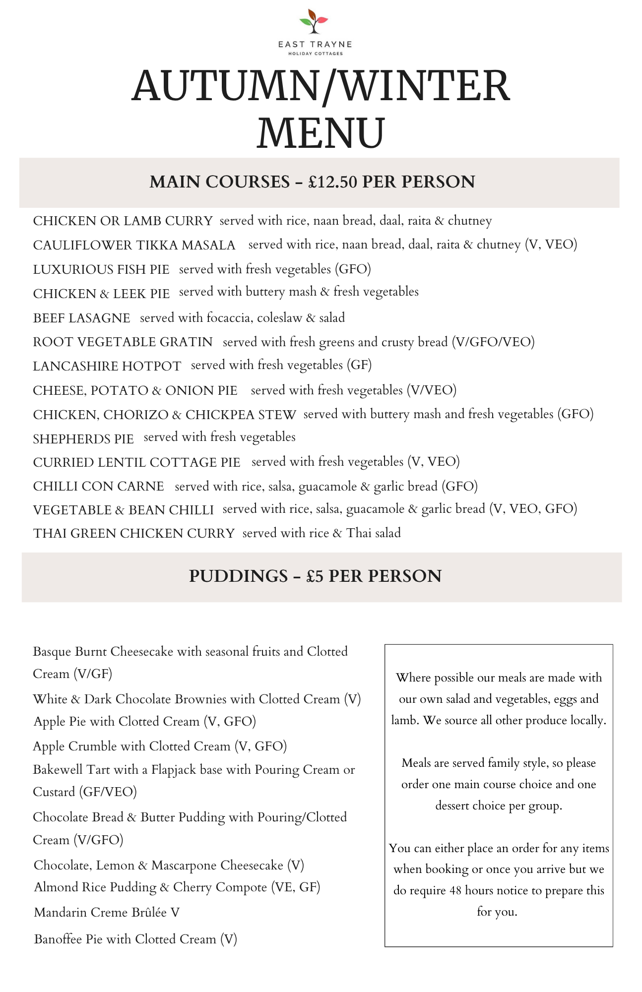 To pre-order any of the above items please mention this in your booking notes or email us on poolea@live.co.uk